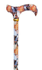 A cheerful Adjustable Fashionable Classic Cats, patterned with smiling cats on a biscuit-colored background, ideal for cat lovers. The cats form a repeating design of tortoiseshell, ginger tabby, silver tabby, black and white (tuxedo), Siamese and Persian colors and breeds, interspersed with a fishbone motif and the letters CC to denote a Classic Canes design. This cane is height-adjustable from 28 1/2 inches to 37 1/2 inches so it can be altered to fit a wide range of users. The shaft is high-quality aluminum, fitted with a non-slip rubber ferrule. It has a chrome collar and a derby handle, elegantly shaped to provide comfortable support. The rubber ferrule size for future replacements is 16mm (5/8 inch) and the cane weighs a little more than a 1/2 pound.