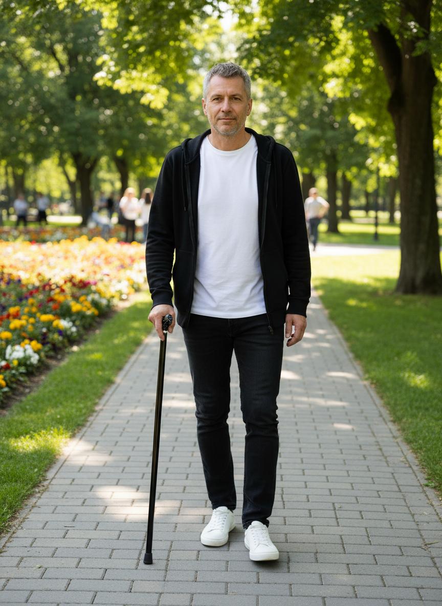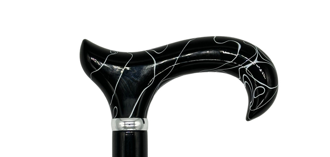 Classy Canes Black and White Swirl Handle on Black Shaft is an attractive cane that features a black finish hardwood shaft. This walking cane has a derby shaped acrylic handle with black and white swirls mixed in that offers comfortable support to cane users. This is just the perfect walking cane to bring along on any occasion. A touch of elegance is visible through the addition of the silver band between the shaft and handle. Classy Canes Black and White Swirl Handle on Black Shaft has a rubber ferule tip. The cane 37 inches long and can be cut to size.