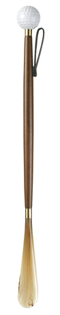 Experience a heightened sense of luxury with the opulent Golf Ball Shoe Horn, featuring a visually stunning wooden design. The meticulously handcrafted shaft is crafted from exquisite Beech Wood, accompanied by a brass sleeve and secure strap, exuding an air of exclusivity. Imported from Italy, renowned for its sophistication and allure, this elegant shoe horn boasts a captivating design inspired by a golf ball head. Measures approximately 23 inches in length.
