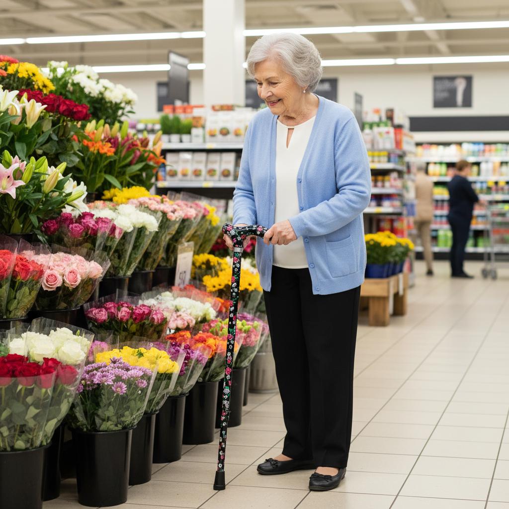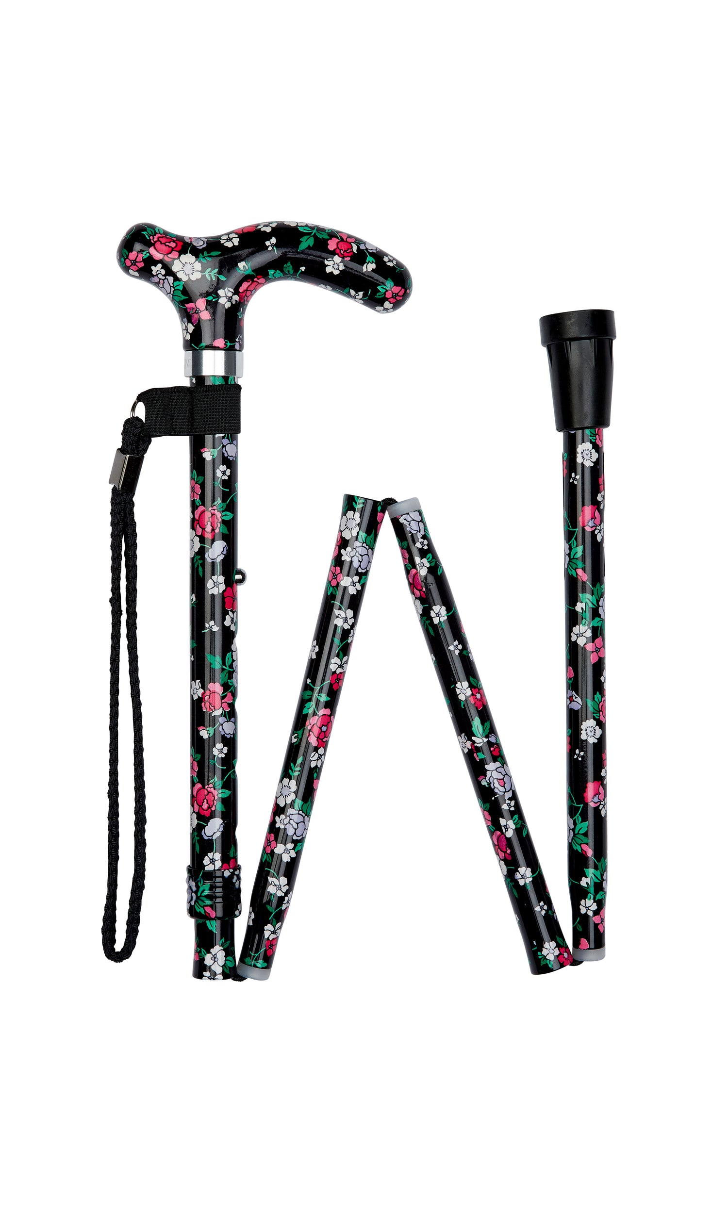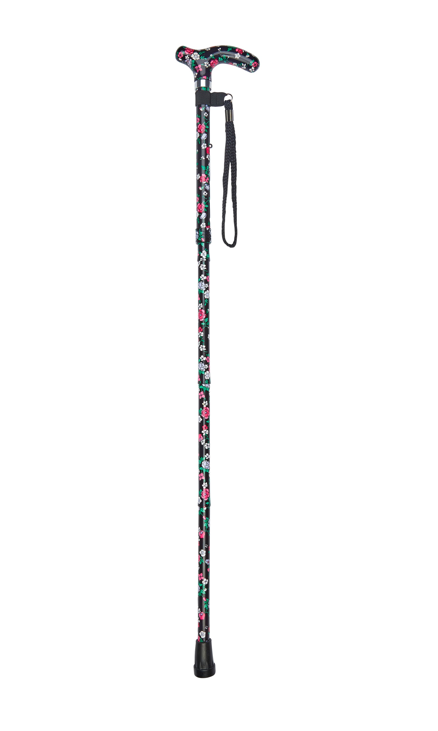 Designed specifically for smaller hands, this Petite Ladies Folding Adjustable cane features a delicate black floral pattern. It combines lightweight durability with a height-adjustable frame secured by a toggle-and-screw mechanism. The acrylic petite derby handle and wrist strap enhance comfort and security, while the rubber tip ensures stable footing. When folded, it measures approximately 10 inches, with an adjustable height ranging from 32 1/2" to 37".