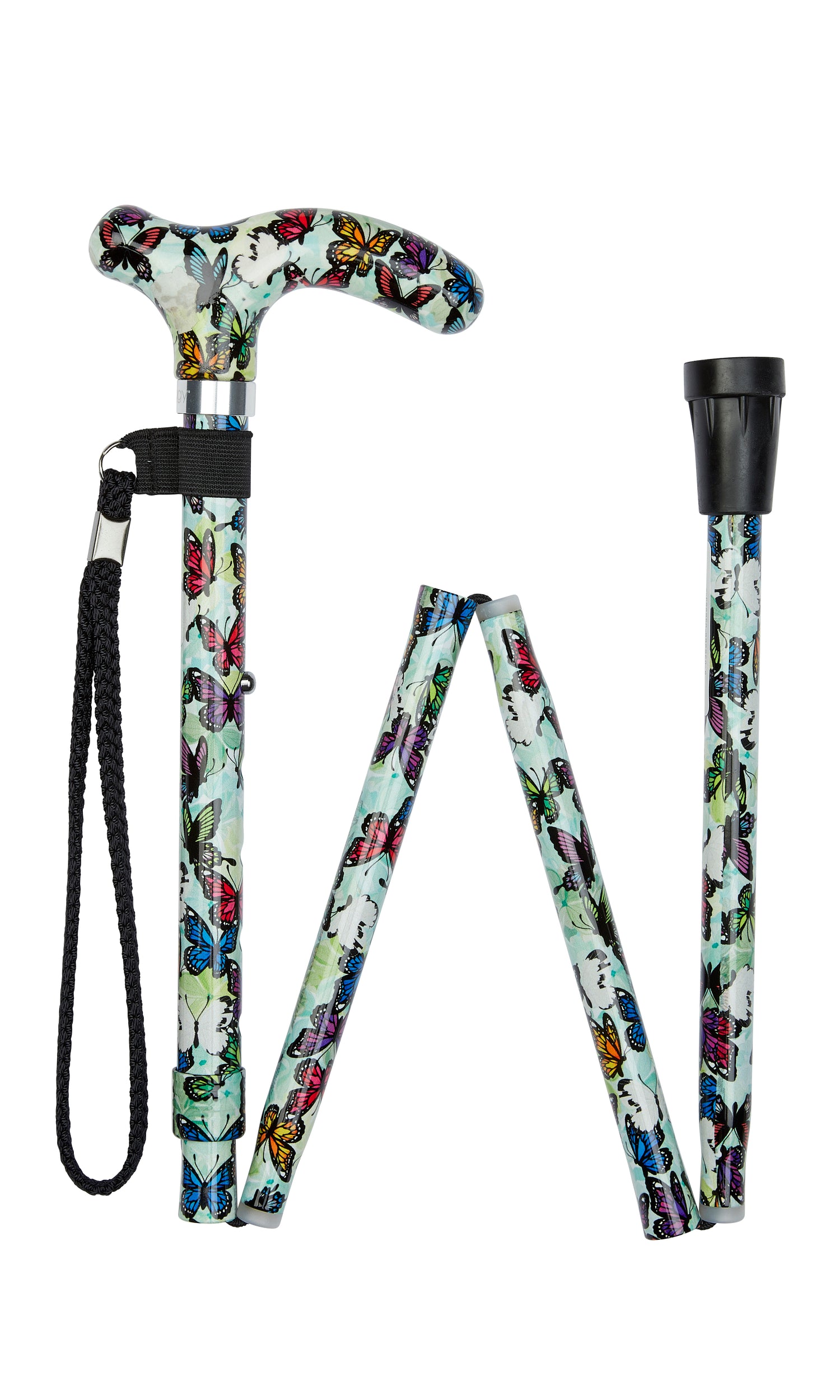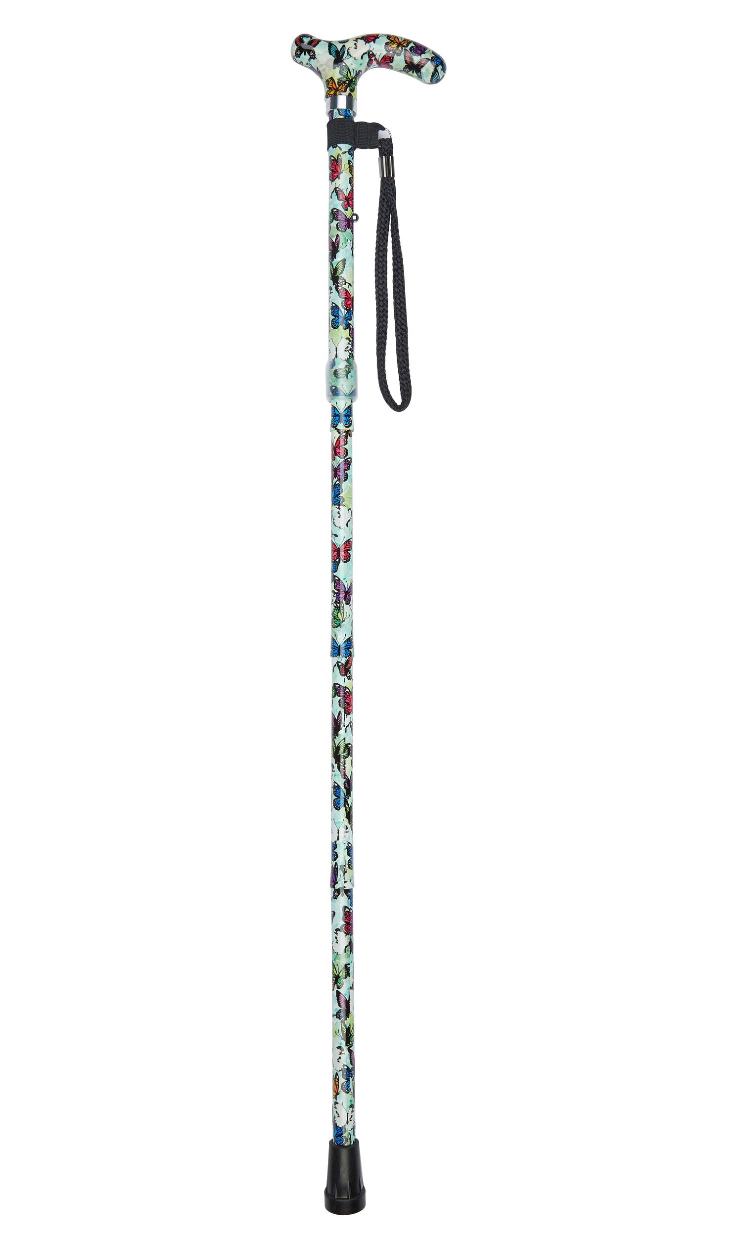 Crafted for smaller hands, this Petite Ladies Folding Adjustable Cane showcases a refined butterfly motif. It combines a robust, lightweight frame with height adjustability via a toggle-and-screw lock. The acrylic petite derby handle paired with a wrist strap delivers optimal comfort and grip, while the rubber tip ensures dependable traction. When folded, the cane measures about 10 inches, extending from 32.5" to 37" to accommodate various user needs.