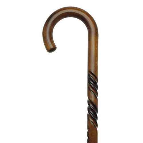 This Tripe Twist features a scorched cherry finish hardwood shaft with carved spiral, The Triple Twist walking cane simply represents classic beauty. Whether you need a sturdy simple walking companion or an elegant walking accessory for a night event, this can work either way. This walking cane has men's crook maple wood handle that offers relaxing support to cane users with a carrying capacity of up to 250 lbs (around 113 kilos). The crook shaped handle also allows a cane user to hang it over his arm when its not in use. The Triple Twist walking cane has an approximate dimension of 5 inches x 1 inch x 36 inches with a steel reinforced suction grip rubber tip # 8-0398-08.